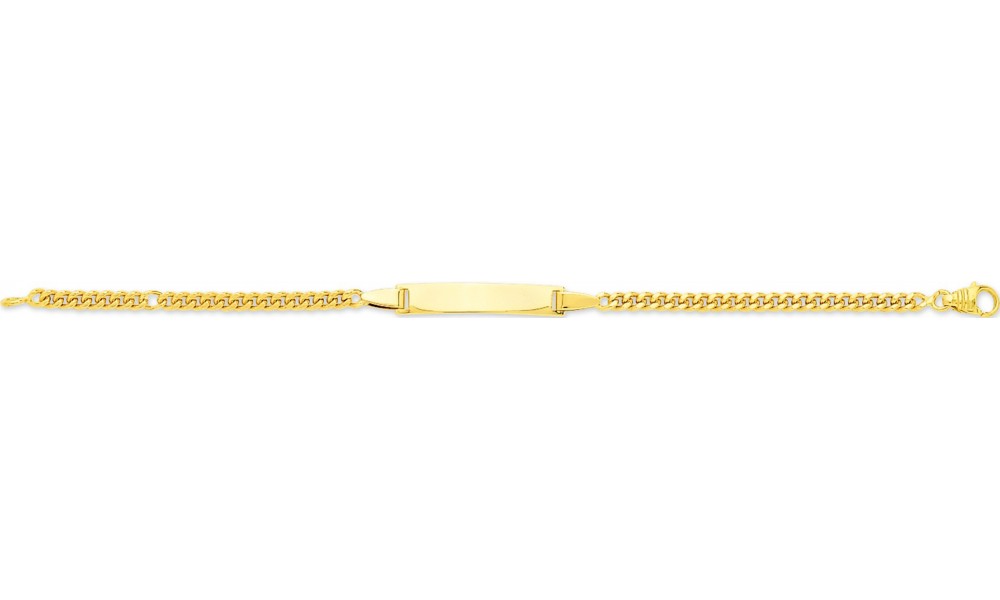 Magnifique bracelet en OR Jaune à graver pour Bébé, composé d'une plaque Rectangulaire et d'une maille Gourmette. Pour que l'enfant profite au maximum de sa gourmette, un anneau intermédiaire à été placé à 12cm.