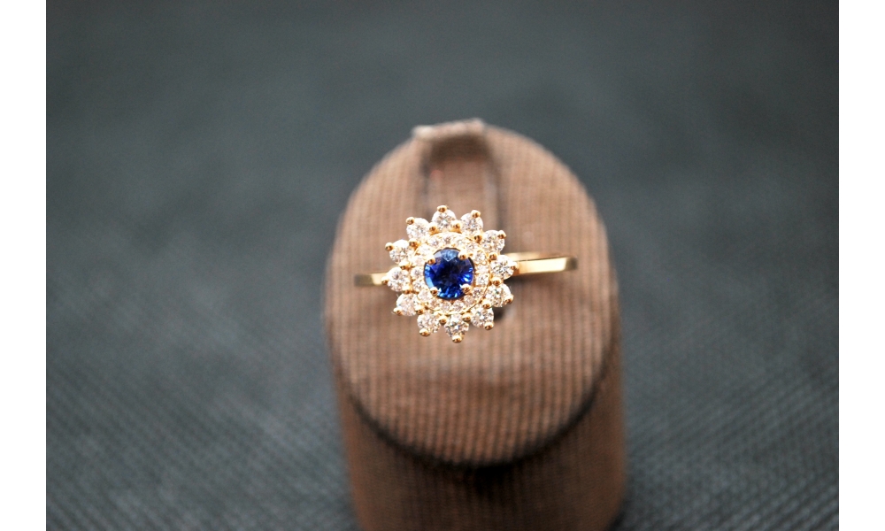 Créé et imaginé dans notre atelier, découvrez cette sublime bague en Or Rose 750 millièmes sertie d'un Saphir Rond de Ceylan et accompagné de 0,45 carat de Diamants en entourage. Sa monture épurée et tout en finance lui donne toute son élégance sans pour autant oublié le qualité de fabrication.