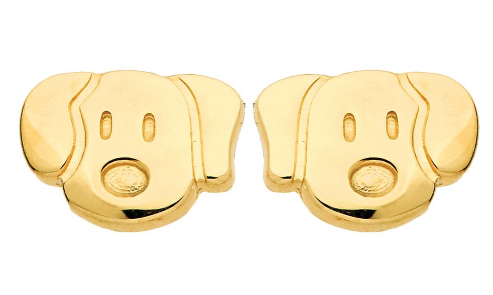 Très jolie paire de boucles d'oreilles en OR Jaune avec une tête de Chien. Le système de fermoir est un système à vis, idéal pour les enfants.