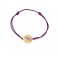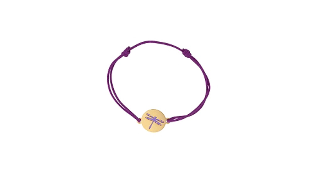 Très joli bracelet moderne avec un motif représentant une Libellule sur une plaque en OR ronde, le tout associé un à cordon en coton de couleur violette.