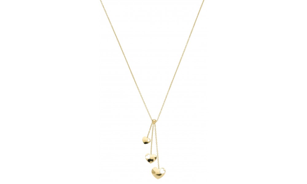 Magnifique collier en OR Jaune avec 3 Coeurs pendants. Les Coeurs sont entièrement en OR Jaune, et légèrement décalé les uns des autres sur le motif. Le motif pendant est relié à la chaine maille Forçat Ronde par une boule en OR Jaune.