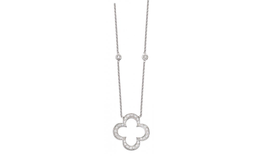 Très joli collier en OR Blanc avec 2 Diamants serti clos sur la chaine maille Forçat et un motif Trèfle au centre entièrement serti de Diamans.