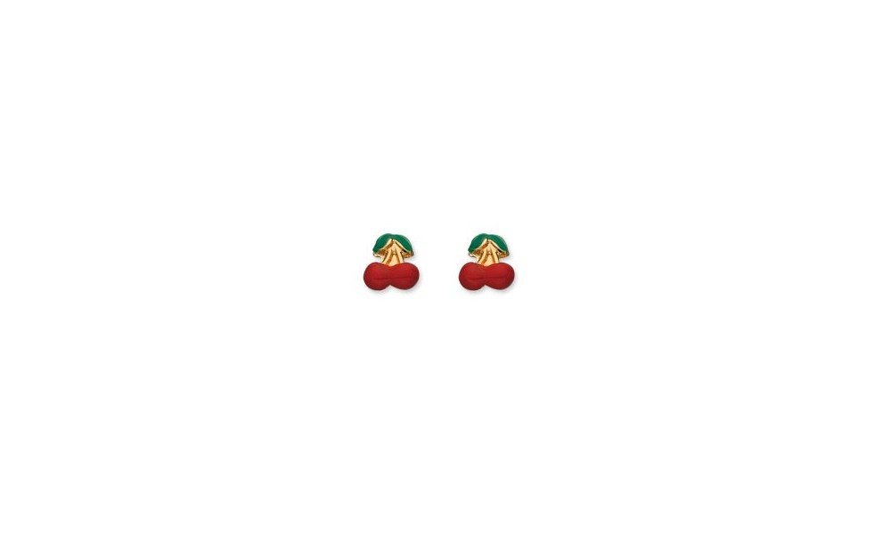 Paire de boucles d'oreilles en OR Jaune. Motif Cerises laquées Rouge et Vert.