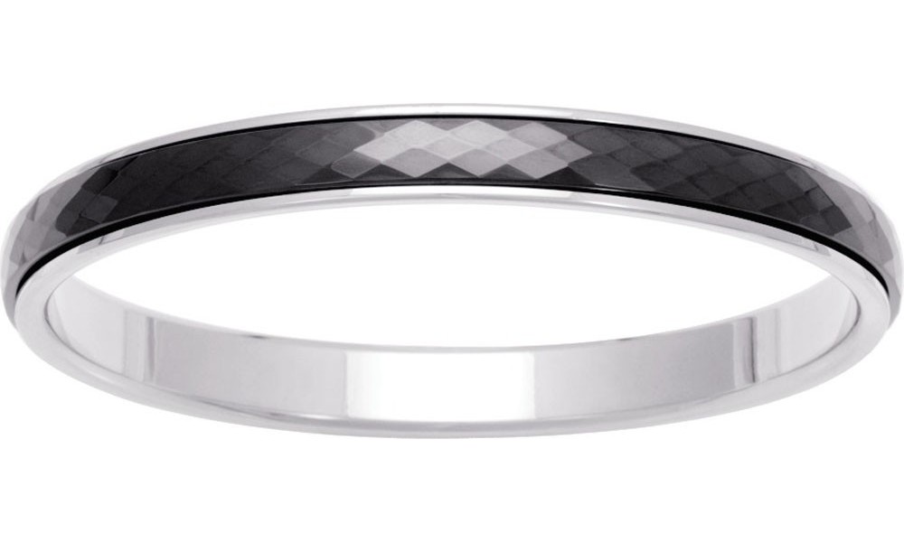 Très beau bracelet Jonc en Acier avec un anneau en Céramqiue Noire incrusté sur le dessus. L'anneau en Céramique Noire et entièrement travaillé par des motifs en forme de Losange.