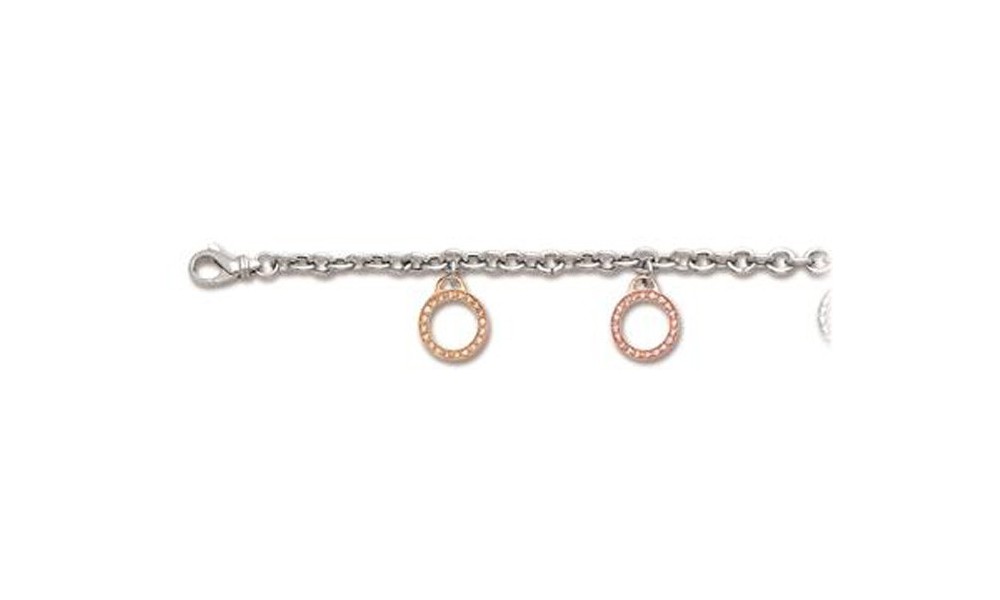 Magnifique bracelet en Argent Massif Rhodié maille Fantaisie Ovale, accompagné de 3 breloques en Argent Massif Rhodié Rose, Jaune et Blanche de forme rondes serties d'Oxydes de Zirconium. Ce bracelet moderne et original est sécurisé par un fermoir Mousqueton.