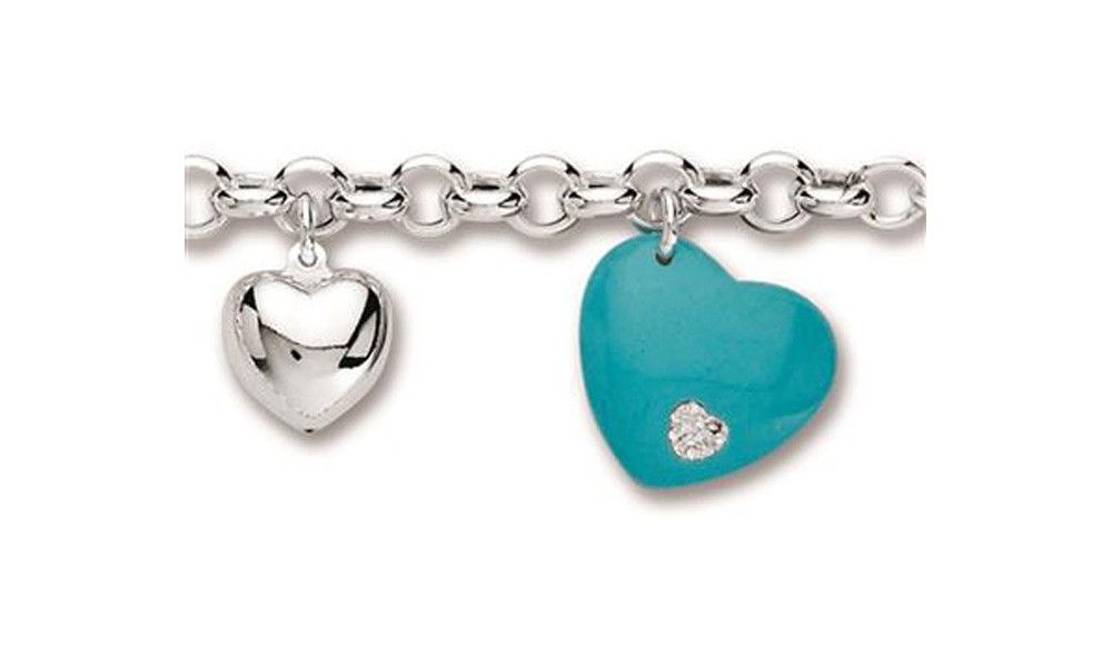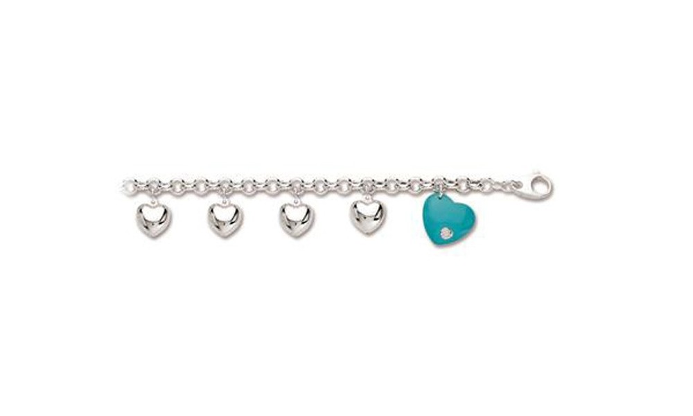 Très joli bracelet en Argent Massif Rhodié maille Jaseron, composé de breloques en forme de Coeurs dont un Coeur Turquoise serti d'un Oxyde de Zirconium. Le bracelet est sécurisé par un fermoir Mousqueton.