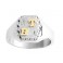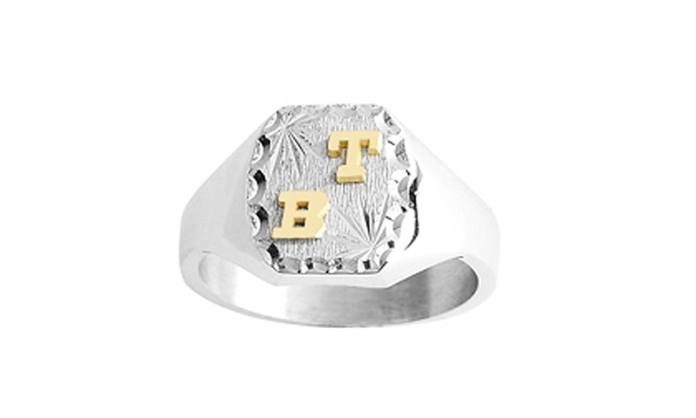 Chevalière en Argent Massif Rhodié avec 2 initiales en OR Jaune. Le plateau de la chevalière est de forme ovale avec un entourage entièrement ciselé. 2 Motifs ciselés Etoile sur le plateau.