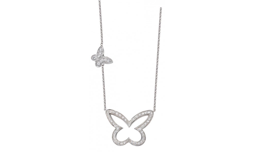 Magnifique collier en OR Blanc avec 2 Papillons sertis de Diamant. Un premier Papaillon se trouve sur la chaine du collier, entièrement serti de Diamants. Le second Papaillon, se trouve au centre du collier, en motif principal.