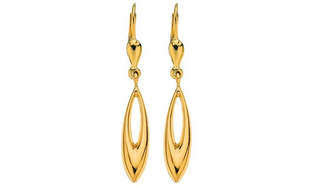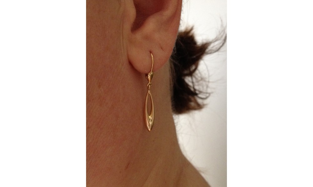 Paire de boucles d'oreilles Pendantes en OR Jaune. Pendant de forme ovale ajouré au centre. Système de fermoir "dormeuse".