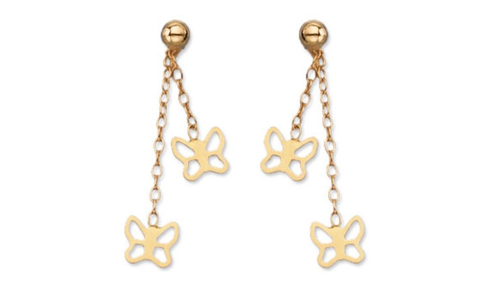 Paire de boucles d'oreilles pendantes en OR Jaune. 2 pendants sur chaque boucle avec chainette maille fantaisie et et motifs Papillons. Fermoir "poussette".