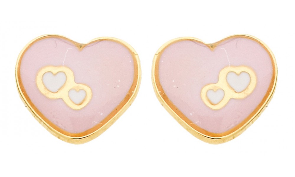 Maginfique paire de boucles d'oreilles en OR Jaune avec un Coeur laqué Rose et Blanc. Le système de fermoir est un système à vis, idéal pour les enfants.