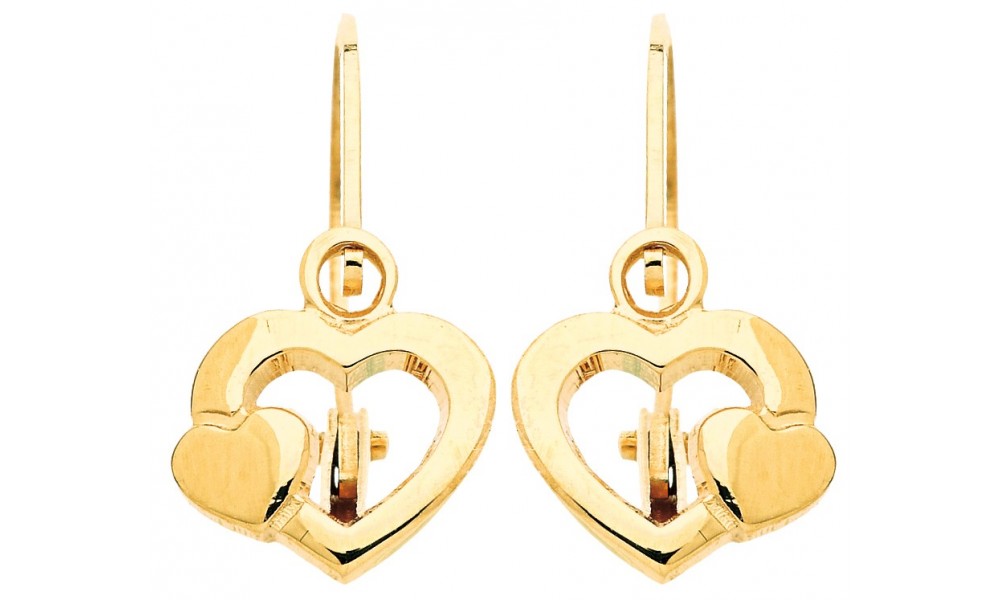 Très jolie paire de boucles d'oreilles en OR Jaune avec un Coeur ajouré et un Coeur plus petit sur le dessus. Le système de fermoir est un système à bascule.