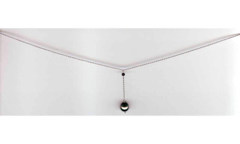 Collier en OR Blanc avec une Perle de Tahiti et un Diamant Noir. Collier avec une chaine maille Forçat. Le pendant est tenu par un Diamant Noir avec au bout une Perle de Tahiti.